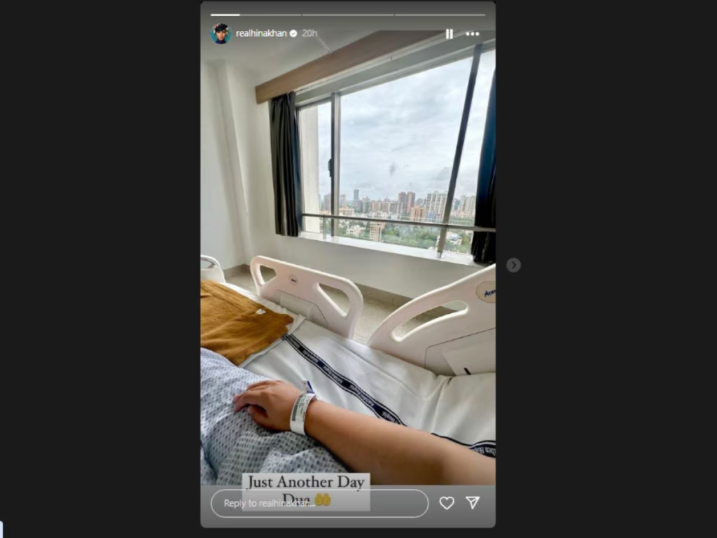 हिना खान ने अपनी इंस्टा स्टोरीज पर एक पोस्ट शेयर किया, जिसमें लिखा था, ‘बस एक और दिन, दुआ करिए.’ इस तस्वीर में हिना खान अस्पताल के बेड पर लेटी हुई दिखाई दे रही हैं. उन्होंने अपने ट्रीटमेंट की हर अपडेट अभी तक सोशल मीडिया पर दी है.